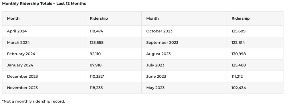 Only the month of December 2023 did not set a record for monthly ridership over the past twelve months, according to VPRA. At 110,352, it fell just short of the record of 111,082 set in December 2022. The month of August 2023 holds the all-time record for monthly ridership at 130,998.