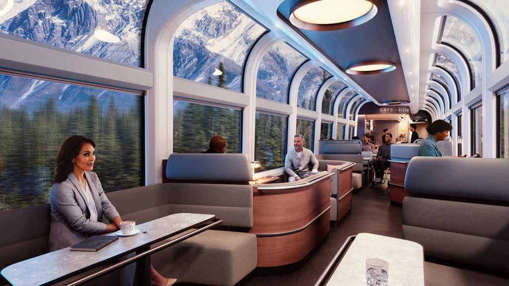 “It is the largest project in VIA Rail’s history,” said VIA Rail, a federal Crown corporation that is mandated to operate passenger rail in Canada. “More than 40 locomotives and 300 cars [such as panorama cars and dining cars with full kitchens] will be built specifically to provide unparalleled accessibility and comfort to our passengers while being able to withstand Canada’s world-renowned winters and scorching summers and covering exceptional distances year after year” (download fact sheet, top).