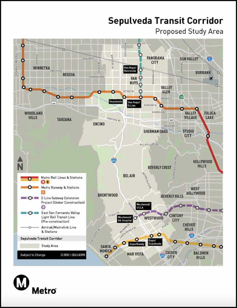 LACMTA has released benefit, anticipated cost and construction schedule details for its Sepulveda Transit Corridor project, which would provide transit service between the San Fernando Valley and the Westside (see map above). Shared during the first of five community meetings held earlier this month, these details, it said, “provide important context that will be considered as the project advances and decisions regarding alternatives are made.” (Download project fact sheet below.)