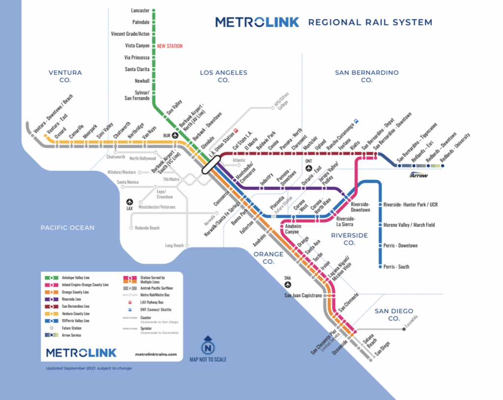Riders can now visit metrolinktrains.com/subscribe to sign up for “Metrolink Alerts”—customized notifications on track changes, line closures and/or other delays impacting their journey. Powered by SimplifyTransit, the alerts are delivered in real-time via text or email; they can be in English or auto-translated into Spanish, Korean, Simplified Chinese or Vietnamese, according to the regional passenger railroad that has 545.6 total service line miles and 67 stations spanning Los Angeles, Orange, Riverside, San Bernardino, Ventura, and San Diego counties (see map below).