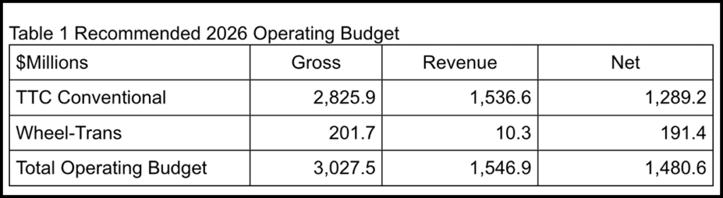 The Toronto Transit Commission (TTC) Board on Jan. 7 signed off on a C$3.028 billion combined 2026 operating budget for its conventional system of bus, subway, and streetcar services (C$2.826 billion in gross expenditures, C$1.537 billion in revenues and a net funding requirement of C$1.289 billion) and Wheel-Trans para-transit service (C$201.6 million in gross expenditures, C$10.3 million in revenues and a net funding requirement of C$191.4 million). It also approved a C$16.7 billion Capital Budget and Plan for 2026-2035, which includes C$1.635 billion for 2026.