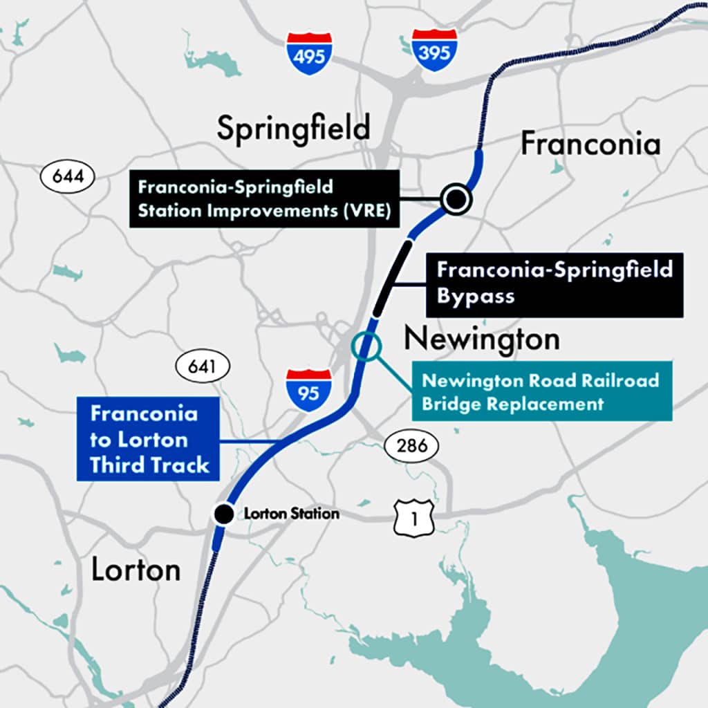The VPRA (Virginia Passenger Rail Authority) $275 million Franconia to Lorton Third Track project will add approximately six miles of main line third track from Franconia to Lorton, creating a continuous triple-track corridor between Alexandria and Lorton. The work includes significant infrastructure modifications to accommodate increased rail capacity and operational efficiency. Key components of the project include the realignment of existing tracks, replacing outdated sections and constructing new bridges over Newington Road and Lorton Road. Upgrades to the signaling and communication systems along the corridor will improve operational coordination. Drainage systems and other support infrastructure will also be upgraded to ensure the expanded system’s durability under varying weather conditions. The modifications will increase the line’s efficiency, reduce delays and improve the overall performance of the VRE (Virginia Railway Express) corridor. A construction start date for March of 2025 has been announced. The Franconia to Lorton Third Track Project will be coordinated with the Franconia-Springfield Bypass Project.