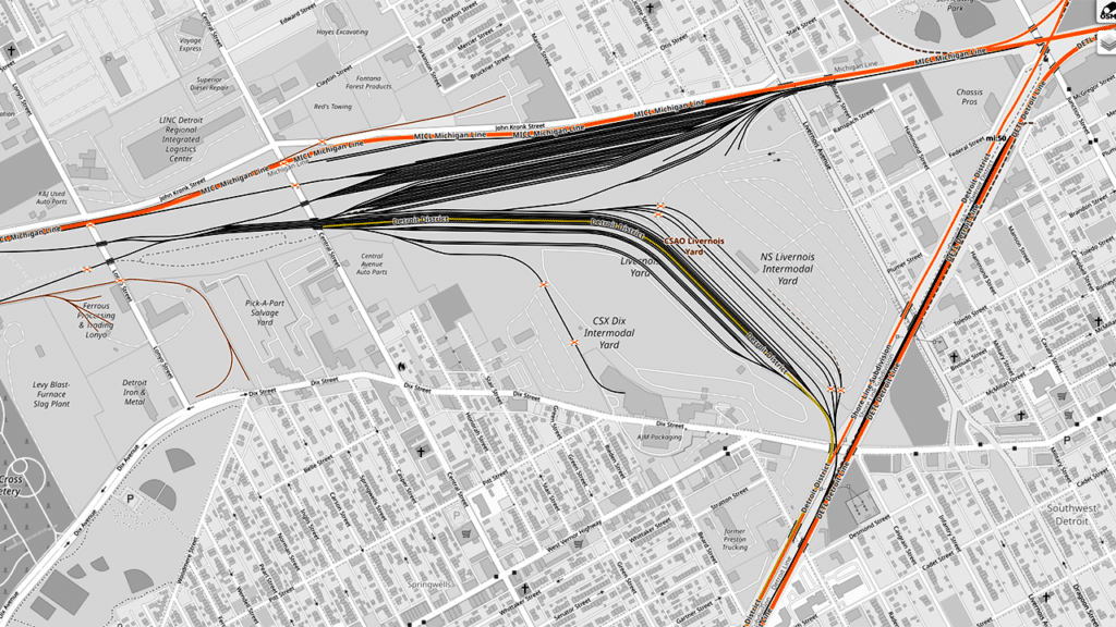 Norfolk Southern’s Livernois Intermodal Facility is adjacent to the CSAO (Conrail Shared Assets Operations, owned jointly by NS and CSX) Livernois Yard. OpenRailwayMap.org.