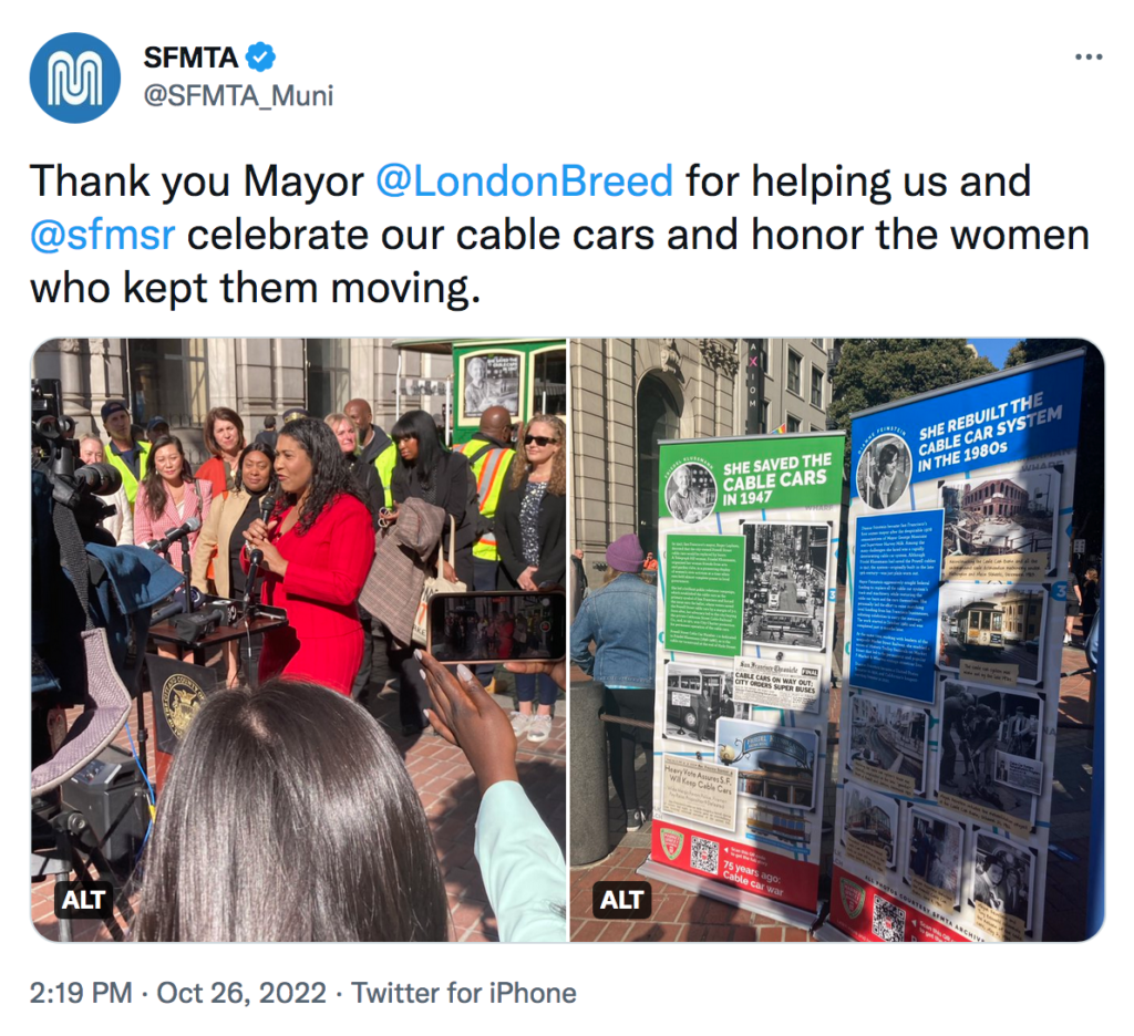 We celebrated this anniversary with Market Street Railway and Mayor London Breed on Oct. 26 at Market and Powell streets (view videos below).