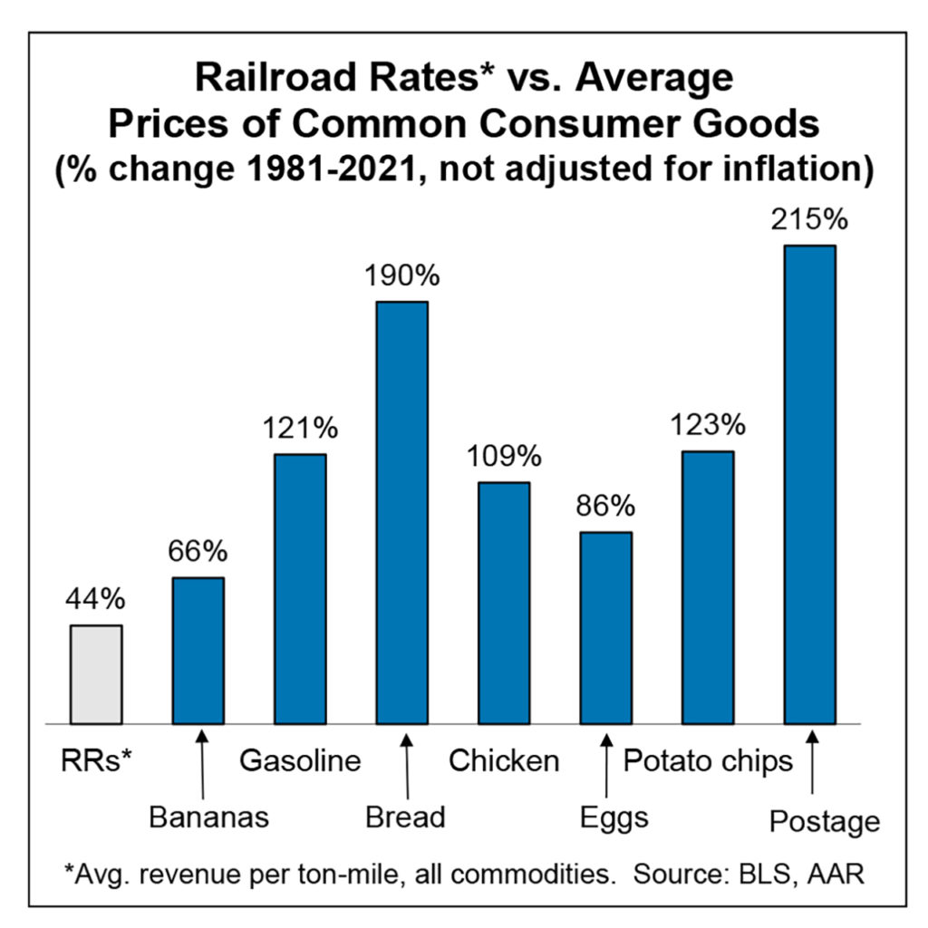 “America’s freight railroads are proud of the tremendous role they play in the U.S. economy. The operations and capital investments of America’s major freight railroads support a million or more jobs and several hundred billion dollars in nationwide economic activity, wages, and taxes. Moving freight by rail meaningfully reduces greenhouse gas emissions. In 2021, U.S. freight railroads moved a ton of freight an average of nearly 500 miles per gallon of fuel, making railroads three to four times more fuel efficient than trucks. Safety is the foundation of everything the railroads do, and the past decade has been the safest in rail history. The train accident rate in 2021 was down 30% from 2000; the employee injury rate was down 47% and the grade crossing collision rate was down 23%. … Average rail rates (measured by inflation-adjusted revenue per ton-mile) were 44% lower in 2021 than in 1981. Changes in rail rates over time compare favorably to changes in the prices of things we buy every day (like bread and potato chips).”