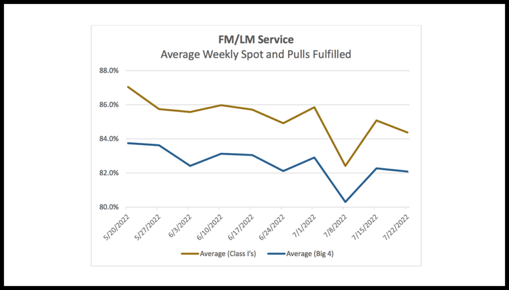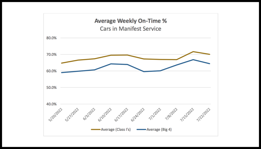 “The system-wide metrics reported in EP 770-1 provide further evidence that overall rail performance has yet to improve significantly. For example, as shown in the attached charts [see above], the weekly average of carriers’ ‘spot and pull’ fulfillment has declined since reporting began. On-time performance for manifest traffic improved somewhat, but progress appears to have stagnated since mid-June.”