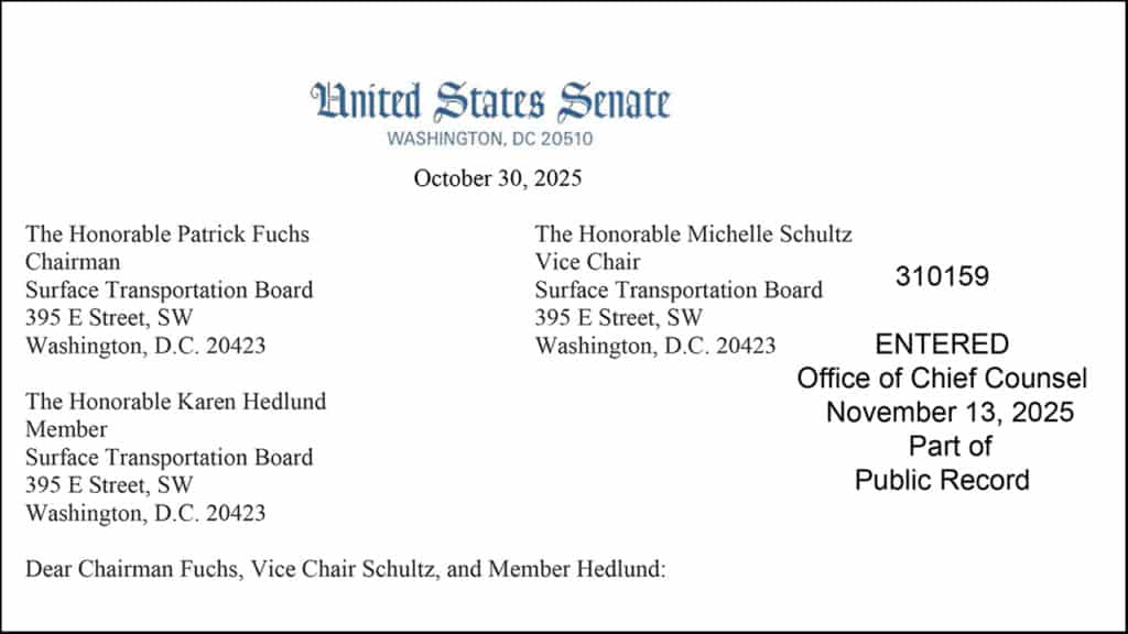 The STB Office of Chief Counsel Counsel entered the letter from the Senators—Republicans John Hoeven (N. Dak.), Tim Sheehy (Mont.), Bill Cassidy (La.), Steve Daines (Mont.), Roger Marshall (Kan.), M. Michael Rounds (D. Dak.), Roger Wicker (Miss.), Jim Banks (Ind.) and Joni Ernst (Iowa); and Democrats Amy Klobuchar (Minn.), Martin Heinrich (N. Mex.), Tina Smith (Minn.), Raphael Warnock (Ga.), Patty Murray (Wash.), Ruben Gallego (Ariz.), Tammy Baldwin (Wisc), Tammy Duckworth (Ill.), , and Dick Durbin (Ill.)—into the public record Nov. 13, 2025: