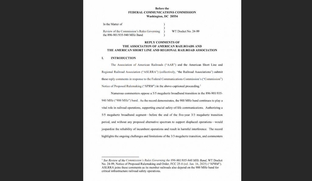The American Short Line and Regional Railroad Association (ASLRRA) and the Association of American Railroads (AAR) on June 16 submitted joint comments in response to the Federal Communications Commission’s (FCC) notice of proposed rulemaking (NPRM) regarding a process to transition the entire 10 megahertz in the 900 MHz band for broadband use in counties where applicants and licensees reach private agreements to do so.