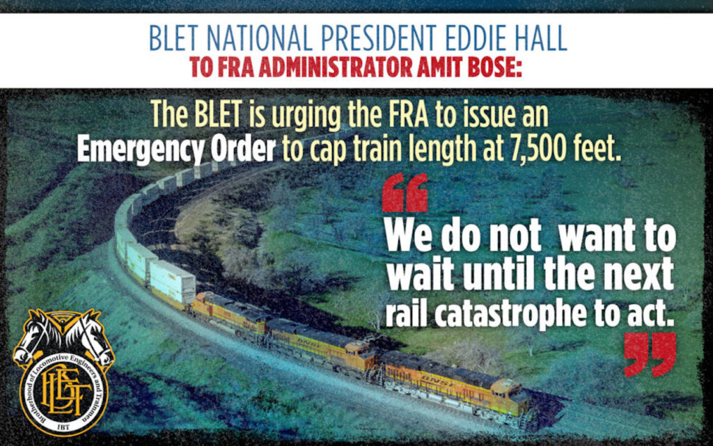 Citing numerous recent accidents caused in part by “excessively long” trains, the Brotherhood of Locomotive Engineers and Trainmen (BLET) is urging the Federal Railroad Administration (FRA) to issue an Emergency Order establishing a maximum train length of 7,500 feet on the nation’s Class I railroads.