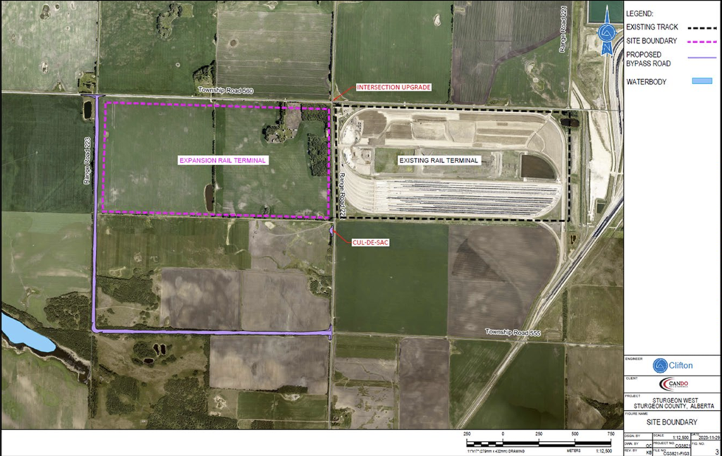 Brandon, Manitoba-based Cando Rail & Terminals is proposing to essentially double the size of its Sturgeon terminal, which opened for business in 2020 in Alberta’s Industrial Heartland, directly west of CN’s Beamer Spur.