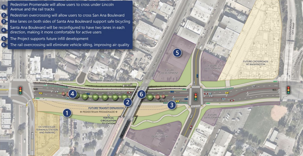 - California: City of Santa Ana’s Santa Ana Boulevard’s Grade Separation Project—The City will receive $25 million to replace “an existing rail crossing with the Southern California Regional Rail Authority Orange Line double tracks at Santa Ana Boulevard, adjacent to the Santa Ana Regional Transportation Center, with a new multi-modal grade separated underpass.” The reconstructed roadway will be reduced from six lanes to four lanes with on-street protected bikeways, sidewalks, and a pedestrian overcrossing is included that will parallel the rail line.