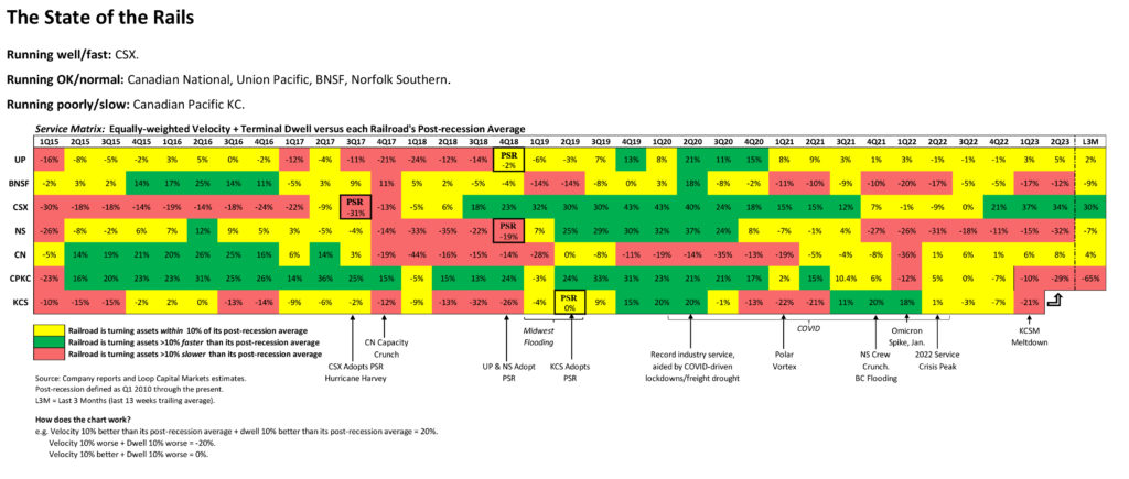 This was part of the PSR grand bargain the railroads made with customers: We’ll simplify the networks, which will result in turning your assets faster, so you’ll need fewer of them. Some reading this will also know that UP uses car-miles per day as one of its primary performance measures, and this is the subset of that number that customers care most about. High private car miles per day = happy customers.