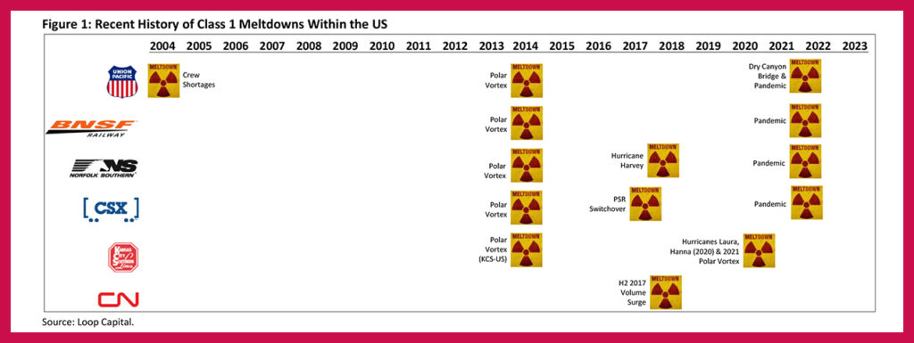 Oh boy, where to begin with this one? Let’s put it this way: Here’s a graphic that shows every Class I meltdown in the U.S. since 2004. Starting in that year, Union Pacific melted down due to a shortage of crews; all the U.S. railroads were slowed by the 2014 polar vortex to the point where they ran out of crews; CN’s late 2017 volume surge depleted crews; domino effects from Hurricane Harvey triggered a crew crunch at Norfolk Southern in 2018; and all of the “Big Four” U.S. systems ran out of crews, again, last year. Crew capacity deficits at key locations were the killer blows that put the railroads into a meltdown state in 12 of the past 14 episodes, with the only exceptions being when Hunter Harrison rushed the CSX PSR implementation and Kansas City Southern was pounded by two hurricanes and a vortex.