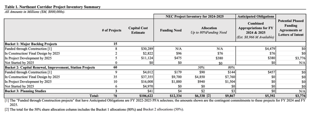 The 2024 NEC Project Inventory comprises two tables. Table 1 (see below) is a summary of the projects. Table 2 (see Inventory above) identifies projects for potential federal investment and includes basic details for each project. According to FRA, the included projects are “those that have scheduled activity during the 2024 Inventory Period and whose Project Sponsors noted an intention to apply for FSP funding” during the five-year BIL authorization period.
