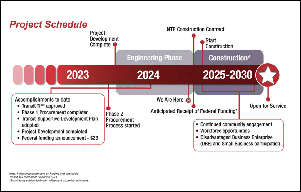 The federal support for the estimated $5.75 billion project comes from FTA’s Capital Investment Grants (CIG) program. CTA entered the Engineering phase of FTA’s New Starts program in 2023. In August 2024, the transit agency’s Board approved a design-build contract with Walsh-VINCI Transit Community Partners. The start of construction is slated for late 2025, with service beginning in 2030.