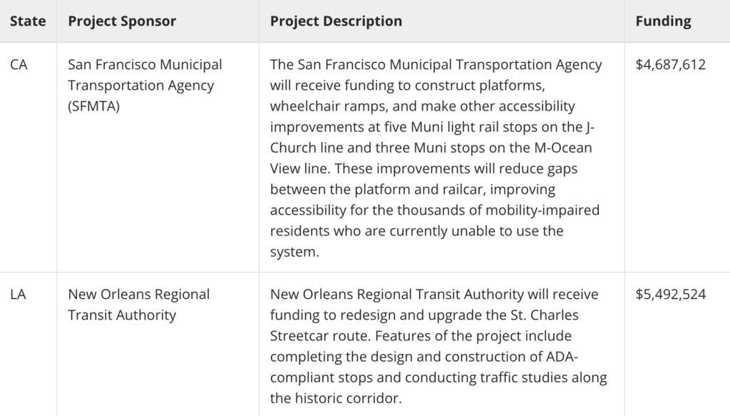 “Since the passage of the Americans with Disabilities Act, great strides have been made in improving accessibility, but there is still a lot of work to accomplish,” FTA Acting Administrator Veronica Vanterpool said. “By modernizing rail systems across the country, the ASAP program provides funding to address these overdue improvements. We want to ensure that all customers can use transit systems with ease and reliability, including people with disabilities, those using mobility devices, and other users needing more accessible spaces.”