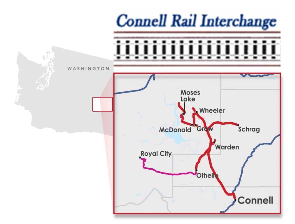 The Connell Rail Interchange, built nearly 100 years ago, is a key rail interchange in eastern Washington where the Columbia Basin rail line intersects with BNSF Railway’s Lakeside Subdivision line, which runs between Spokane and Pasco, Wash. The Columbia Basin rail line goes through the heart of the Columbia Basin in eastern Washington and serves Moses Lake, Wheeler, Schrag, Warden, Othello, Royal City, Bruce, and Connell in Grant, Adams and Franklin Counties.
