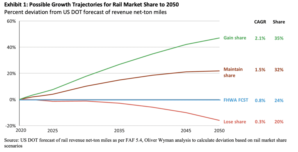 To put context around what a continued loss of rail market share could mean for our society as well as rail stakeholders, I would like to summarize an analysis that Oliver Wyman performed in 2022, in which we looked at the implications of several scenarios for rail market share through 2050. These are shown in Exhibit 1.