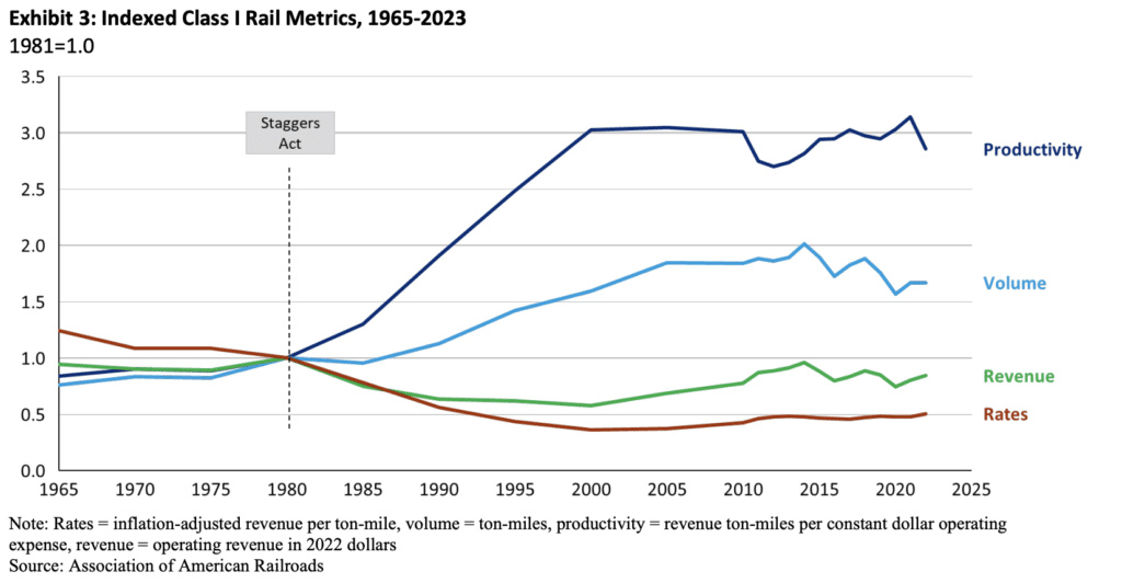 Next, I would like to briefly review what is causing current rail market share erosion. Since the Staggers Act deregulated rail in 1980, the railroads have delivered tremendous improvements in productivity – much of which has been delivered back to shippers and consumers in the form of rate reductions, as shown in Exhibit 3.