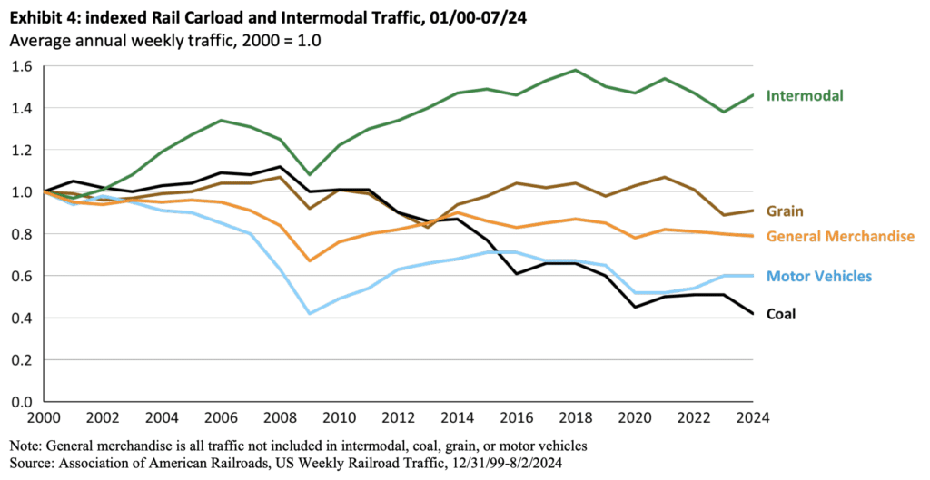 It is tempting to attribute the railroads’ market share loss exclusively to the decline of coal, but as shown in Exhibit 4, except for intermodal, major non-coal sectors of rail freight also have not been growing. Truck ton-miles, on the other hand, have grown steadily by 1.4 percent a year since 2000.