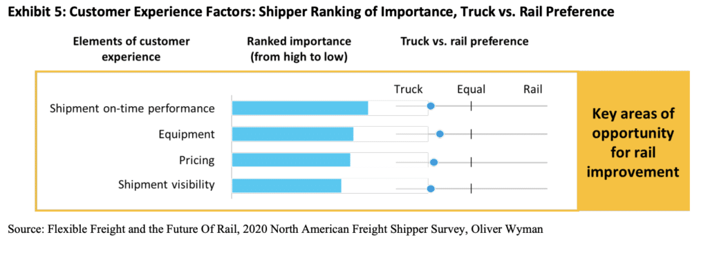 What is behind this shift? In 2020, Oliver Wyman surveyed large rail shippers to identify some of the key reasons as well as their views on what might reverse this trend. Notably, 100 percent of the executives we surveyed found truck to be superior to rail on all attributes of customer experience, as shown in Exhibit 5. At the same time, shippers consistently told us that they want to do more with rail because of its advantages, but that the product and experience simply are not meeting their supply chain needs.