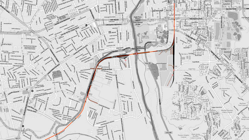 GER said the existing border crossing in the City of Eagle Pass is the second busiest rail crossing between the U.S. and Mexico. It noted that currently rail traffic crosses the U.S./Mexican border at Eagle Pass via a single-tracked bridge belonging to UP on the U.S. side and owned by the Mexican federal government with rail operations concessioned to Ferromex on the Mexican side of the border; BNSF also operates on the line via trackage rights. Additionally, GER said, the current Eagle Pass Port of Entry rail bridge “is situated within the congested areas of the City of Eagle Pass, and Piedras Negras, Coahuila” and traverses nine at-grade rail crossings in the City of Eagle Pass and 16 at-grade crossings in Piedras Negras.