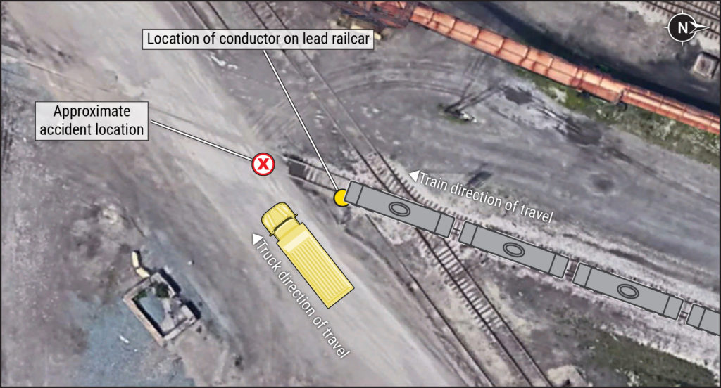 The crew of train C75B106 consisted of an engineer in the locomotive cab and the conductor. The train was composed of one locomotive and 12 mixed railcars: four residue tank cars and eight empty covered hopper cars. The dump truck was driven by a TMS International employee and was hauling rock at the time of the collision. Cleveland Cliffs surveillance camera data reviewed by NTSB investigators show the dump truck traveling south through the plant, stopping at the private grade crossing, and then proceeding through the crossing. Based on event recorder data, the train was traveling about 9 mph at the time of the collision; the maximum authorized speed within the steel plant was 10 mph. The private grade crossing where the accident occurred was equipped with stop signs facing both directions of approach.