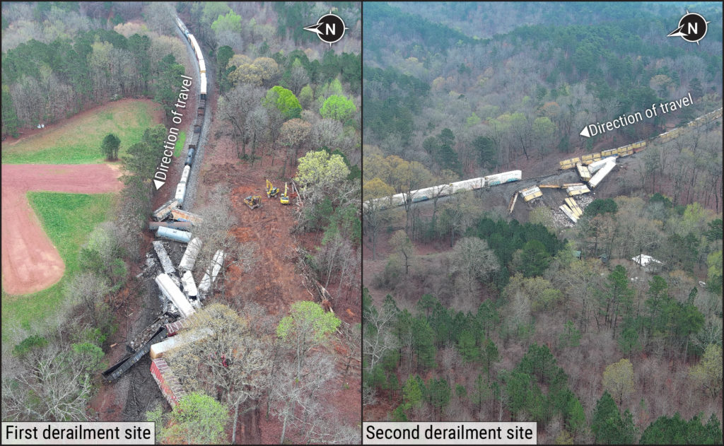 ​Aerial view of the first March 9 derailment site (left) and the second derailment site (right). (Courtesy of Norfolk Southern)​