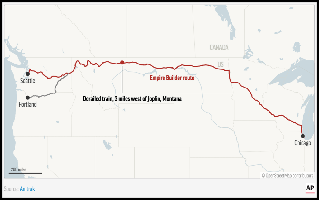 NTSB said it will issue a report “at a later date” that includes analysis, findings, recommendations and probable-cause determinations related to the derailment, which led to the deaths of three passengers and injuries to 49 of the other 151 passengers and crew members on board. The accident occurred in a right-hand curve of BNSF track approximately three miles west of Joplin, which is about 100 miles north of Great Falls, in the vicinity of Buelow, Mont. (See map below.) The westbound Amtrak train included two locomotives and 10 cars, five of which derailed.