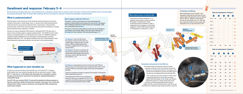 The illustrated digest (download below), NTSB says, serves as a companion to the agency’s 201-page final report, using photos and graphics to illustrate how and why the derailment occurred, as well as explaining NTSB safety recommendations to prevent similar accidents in the future. While the final report remains the NTSB’s definitive publication on the derailment, the digest “highlights the depth and scope of the 16-month investigation,” the agency noted.