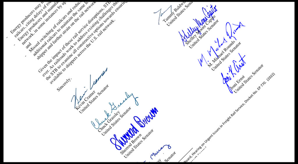 The letter to the STB is signed by Senators Kevin Cramer (R-N.Dak.), Tammy Baldwin (D-Wisc.), Shelley Moore Capito (R-W.Va.), Chuck Grassley (R-Iowa), Sherrod Brown (D-Ohio), Mike Rounds (R-S.Dak.), Patty Murray (D-Wash), Marco Rubio (R-Fla.), Tammy Duckworth (D-Ill.), Mike Crapo (R-Idaho), Jim Risch (R-Idaho), Tina Smith (D-Minn.), Mark Kelly (D-Ariz.), John Hoeven (R-N.Dak.), John Kennedy (R-La.), Joe Manchin (D-W.Va), Roger Marshall (R-Kan.) and Amy Klobuchar (D-Minn.). No doubt, there are some sincere folks in this bunch, but I can’t tell you which ones they are.