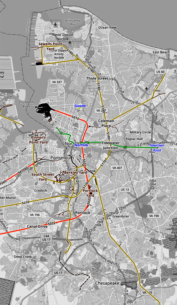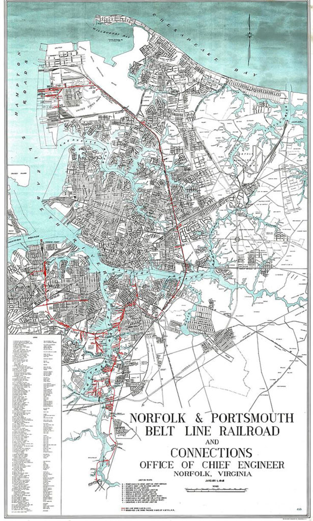 A Class III S&T incorporated in the Commonwealth of Virginia as the Southeastern & Atlantic Railroad Company in 1896, NPBL is owned 57% by Norfolk Southern and 43% by CSX. It currently owns 26 route-miles (36 track-miles) and operates 27 route-miles under trackage rights in the Hampton Roads communities of Norfolk, Portsmouth and Chesapeake, Va. NPBL adopted its current corporate name in 1898 and acquired and absorbed the Elizabeth River Railroad in 1910. It was originally formed by Norfolk & Western, Chesapeake & Ohio, Southern Railway Co., New York, Philadelphia & Norfolk, Atlantic & Danville Railway, Atlantic Coast Line, Norfolk Southern Railway (1942–1982), and Seaboard Air Line. NPBL interchanges with Chesapeake & Albemarle Railroad, CSX and NS. NPBL serves 24 marine terminals and industries, linking the deepwater port from Sewells Point to Portsmouth Marine Terminal, including the Southern Branch Elizabeth River. It operates one main classification yard located in the South Norfolk area of Chesapeake, where its headquarters, T&E and maintenance-of-way facilities are also located.