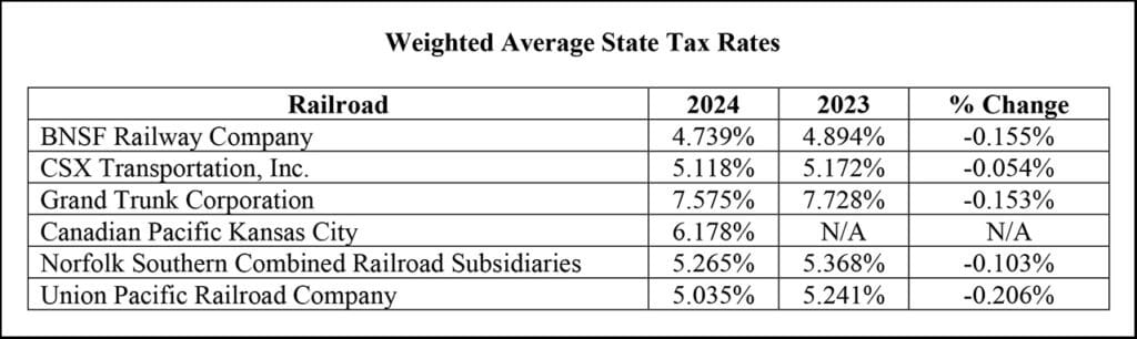 Pursuant to 49 CFR 1135.2 (Revenue Shortfall Allocation Method: Annual State Tax Information), AAR is required to annually calculate and submit to the Board the weighted average state tax rate for each Class I railroad for the previous year. On May 30, 2025, AAR filed its calculation of the weighted average state tax rates for 2024, listed below for each Class I railroad: