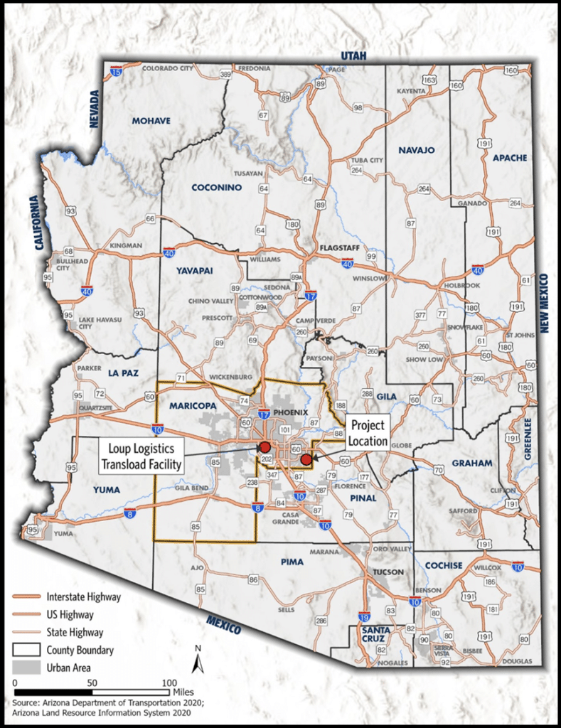 The PIRATE project would connect the Pecos Advanced Manufacturing Zone to UP’s main line at the border between Maricopa and Pinal counties (see map below). It would serve Commercial Metals Company’s new steel facility.