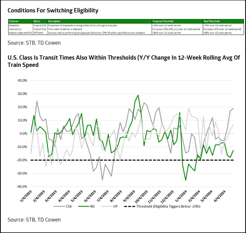 The STB settled on a 20% increase in transit time (or decrease in train speed) as a trigger for switching eligibility, picking the stricter of the thresholds the Board was contemplating in its proposed rule. The STB has also introduced a thre-year rule, allowing eligibility if transit time deteriorates 25% over a three-year period. Train speed change for the purposes of the rule is calculated on a y/y basis using a 12-week average. Data on train speed shows that U.S. Class I 12-week rolling average train speeds rarely fell below 20% on a y/y basis last year.