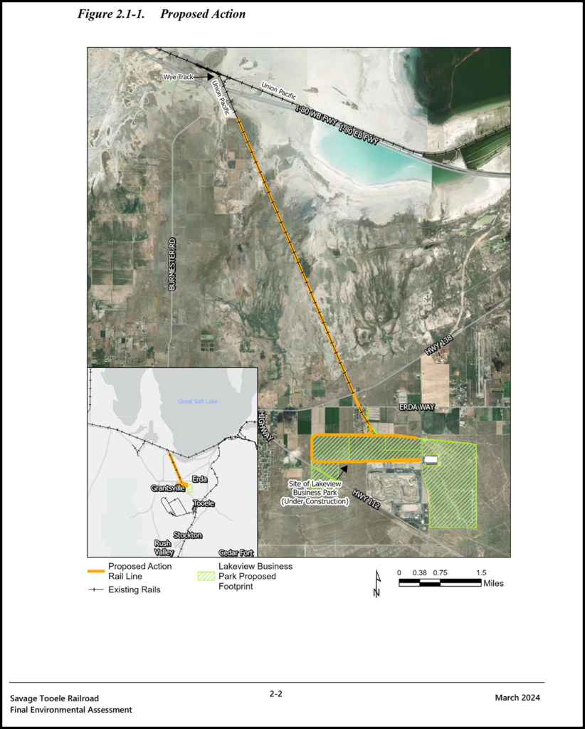The STB’s Office of Environmental Analysis report specifies that Savage Tooele Railroad Company would re-institute common carrier service over an approximately 6-mile segment of the former Warner Branch (abandoned in 1983 by UP predecessor Western Pacific Railroad Company); tracks remain on some 5.75 miles of the right-of-way. It would also construct about five miles of rail line within the Park, which is currently under development and has two tenants receiving commercial truck service. Additionally, it would build four 2,500-foot segments of ancillary switching (or interchange) track to offload and onload railcars to and from the UP main line. Savage Tooele Railroad Company anticipates that construction would take approximately six months.