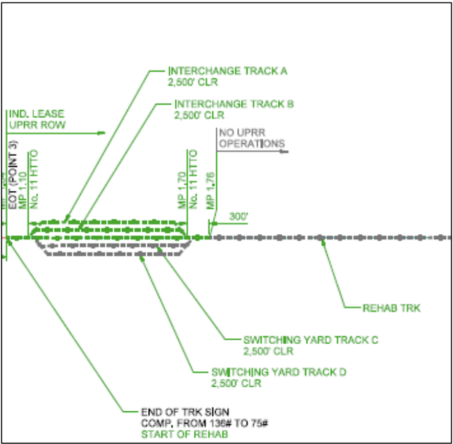 According to the STB’s Final Environmental Asessment, “UP trains would leave the Shafter Subdivision, enter the Savage Tooele Railroad Company’s railroad line through UP wye track and deliver the railcars destined for Savage Tooele Railroad Company’s customers to the ancillary (interchange) tracks to be constructed between mileposts 1.10 and 1.70. UP would deliver railcars to track A and pick up the railcars Savage Tooele Railroad Company has released from interchange track B [see above] … UP would then depart back through its wye track and re-enter the Shafter Subdivision. Savage Tooele Railroad Company trains would deliver railcars picked up from UP to customers and then return them back to the interchange yard.”