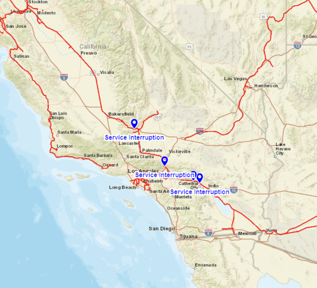Union Pacific (UP) is among the railroads affected. Its Mojave and Yuma subdivisions were out of service due to water and mud over the tracks in Southern California between Banning and Indio, near Mojave, and 10 miles north of Fontana (see map, below). According to the railroad, widespread road and interstate closures were impacting its ability to transport crews to operate trains, and public electrical outages were impacting operations in some terminals.