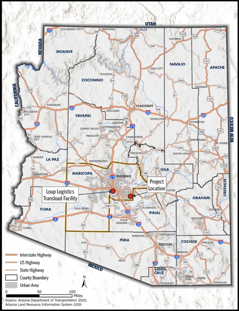 UP in June 2022 filed a petition for exemption to allow the rail line’s launch in connection with the Pecos Industrial Rail Access and Train Extension Project or the PIRATE project. The line would connect the Pecos Advanced Manufacturing Zone (PAMZ) to the UP main line west of the project area and provide rail service for Commercial Metals Company (CMC)—said to be largest manufacturer of steel rebar in North America and Central Europe, as well as a leading producer in the steel long products market—as well as an alternative mode of freight transportation to future shippers (see maps below). According to UP, the line will allow CMC to receive raw materials and ship products to customers by rail more efficiently from two facilities in Mesa, eliminating an estimated 35,000 trucks per year.