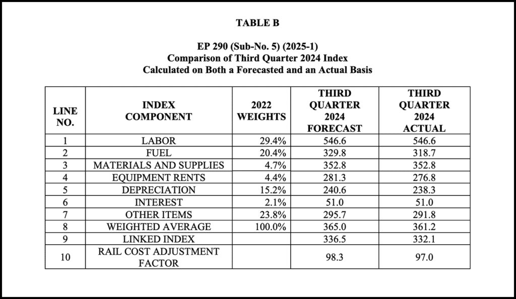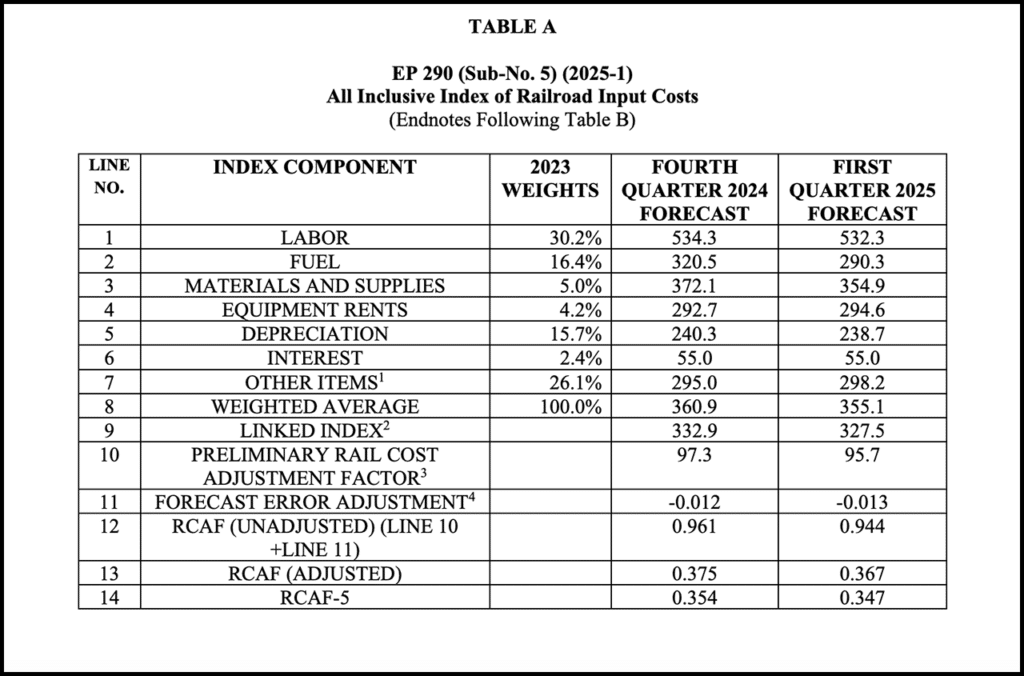 The Surface Transportation Board (STB) has adopted for first-quarter 2025 the rail cost adjustment factor (RCAF), which is defined as “an index formulated to represent changes in railroad costs incurred by the nation’s largest railroads over a specified period of time.”