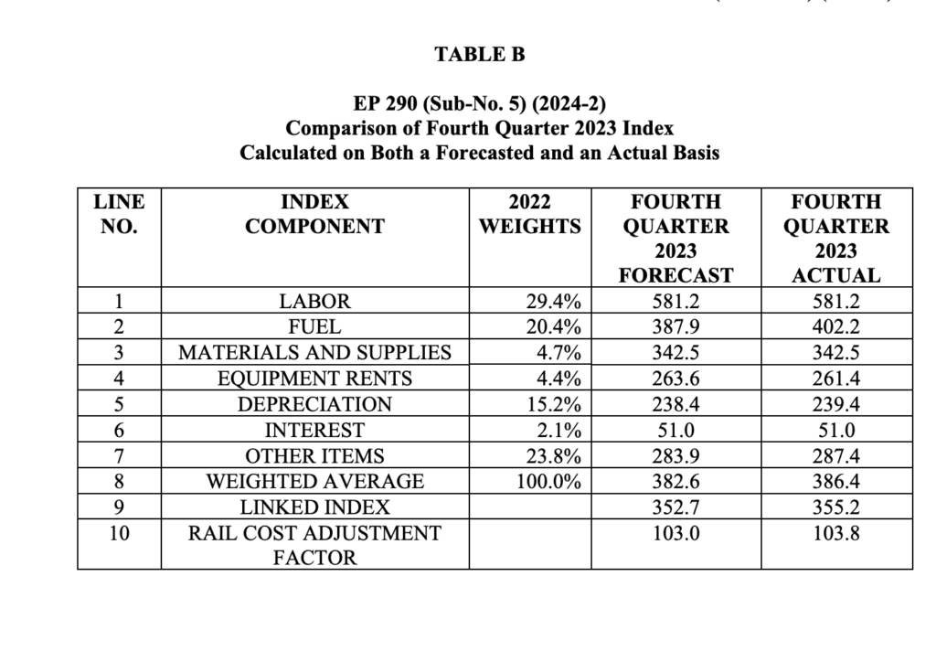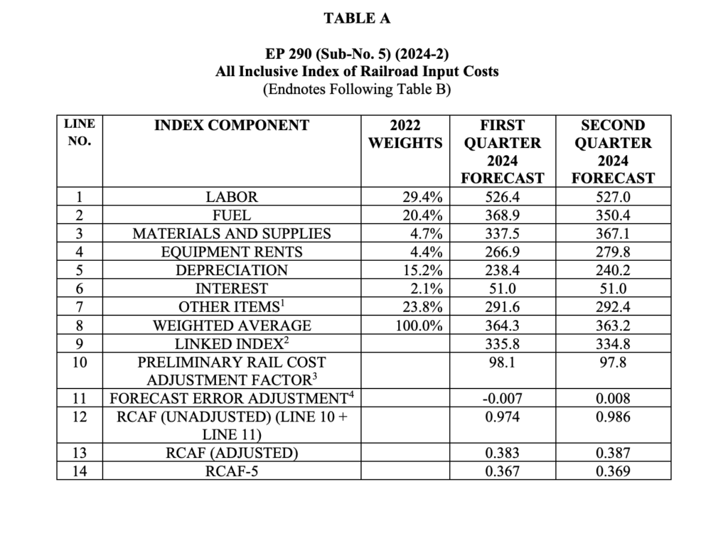 The STB on March 20 reported that it had reviewed AAR’s submission (download below) and adopted these figures for second-quarter 2024: unadjusted RCAF, 0.986 (up 1.2% from first-quarter 2024’s 0.974); adjusted RCAF, 0.387 (up 1.0% from first-quarter 2024’s 0.383); and RCAF-5, 0.369 (up 0.5% from first-quarter 2024’s 0.367).
