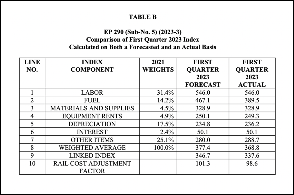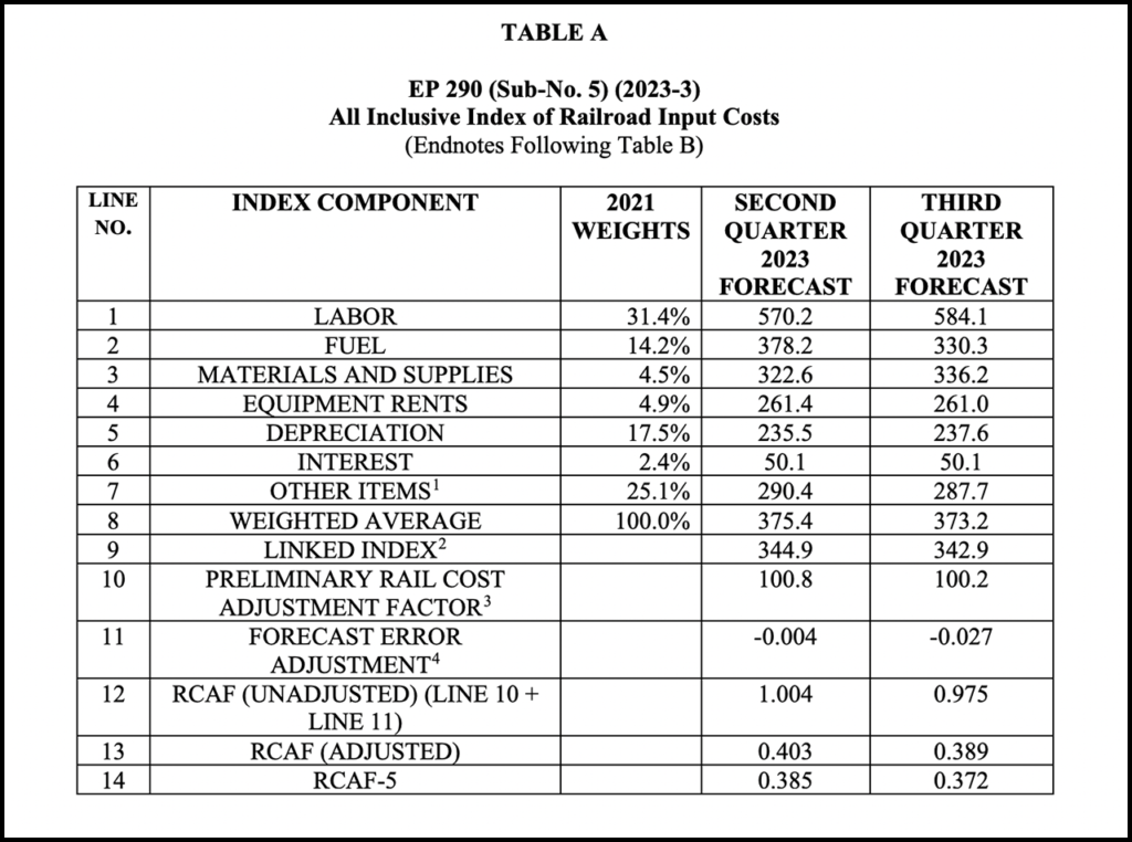 The STB on June 15 reported that it had reviewed AAR’s submission (download decision below) and adopted the figures for third-quarter 2023: unadjusted RCAF, 0.975 (down 2.9% from second-quarter 2023’s 1.004); adjusted RCAF, 0.389 (down 3.5% from second-quarter 2023’s 0.403); and RCAF-5, 0.372 (down 3.4% from second-quarter 2023’s 0.385).