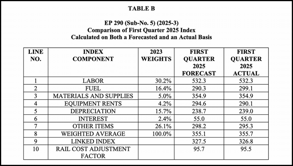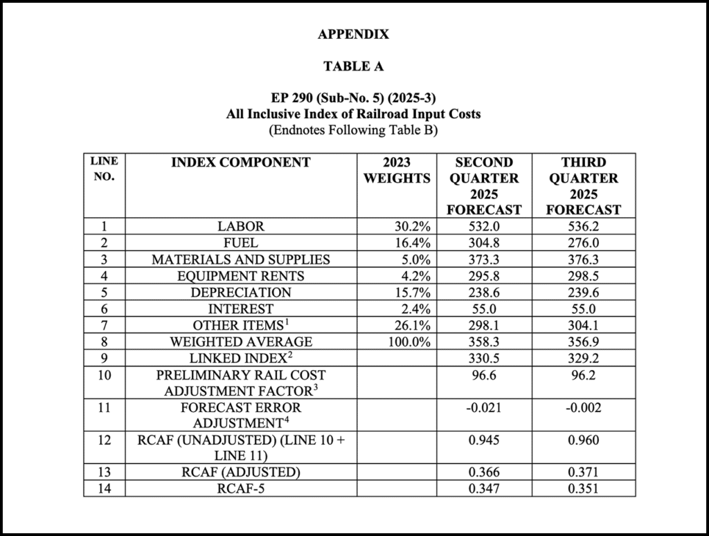The STB, in its June 16 decision (scroll down to download), reported that it has reviewed AAR’s submission and adopted the RCAF figures for third-quarter 2025: unadjusted RCAF, 0.960 (up 1.6% from second-quarter 2025’s 0.945); adjusted RCAF, 0.371 (up 1.4% from second-quarter 2025’s 0.366); and RCAF-5, 0.351 (up 1.2% from second-quarter 2025’s 0.347).