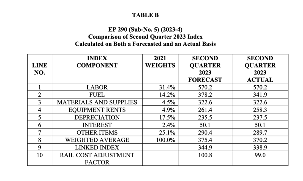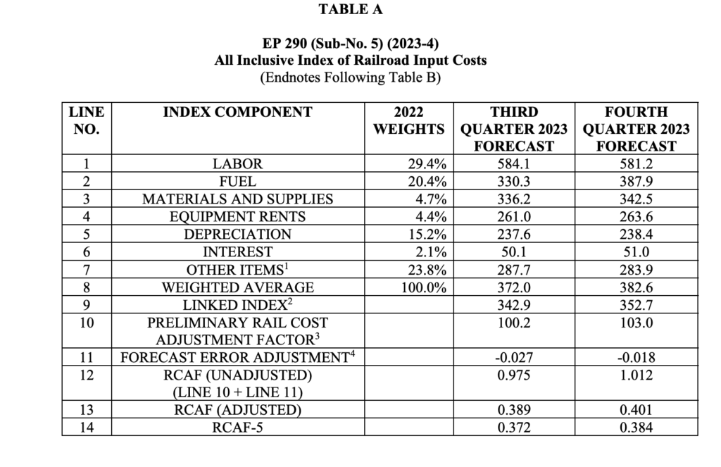 The STB on Sept. 18 reported that it had reviewed AAR’s submission (download decision below) and adopted the figures for fourth-quarter 2023: unadjusted RCAF, 1.012 (up 3.7% from third-quarter 2023’s 0.975); adjusted RCAF, 0.401 (up 3.0% from third-quarter 2023’s 0.389); and RCAF-5, 0.384 (up 3.2% from third-quarter 2023’s 0.372).