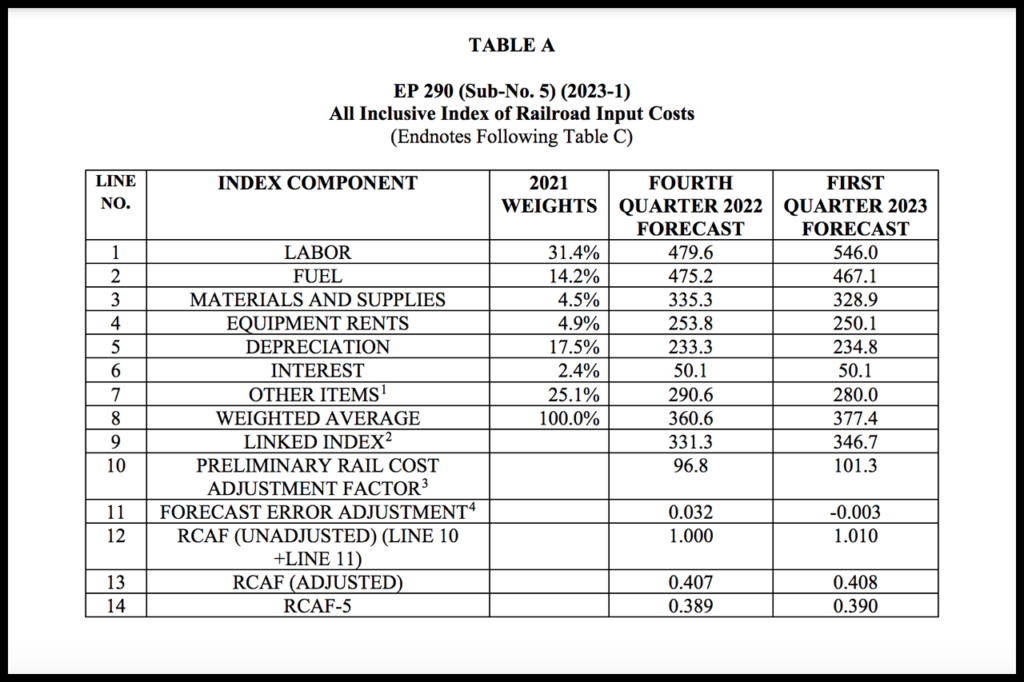 The STB on Dec. 20 reported that it has reviewed AAR’s submission and verified its proposed rebasing calculations; as required by statute, the denominator of the RCAF is to be rebased every five years (scroll down for the calculations, Table C). The STB adopted these figures for first-quarter 2023: unadjusted RCAF, 1.010 (up 1.0% from fourth-quarter 2022’s 1.000); adjusted RCAF, 0.408 (up 0.2% from fourth-quarter 2022’s 0.407); and RCAF-5, 0.390 (up 0.3% from fourth-quarter 2022’s 0.389).