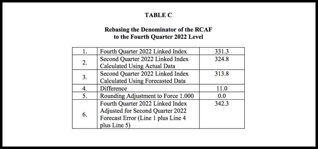 Table B shows the third-quarter 2022 index and the RCAF calculated on both an actual and a forecasted basis. The difference between the actual calculation and the forecasted calculation is the forecast error adjustment: