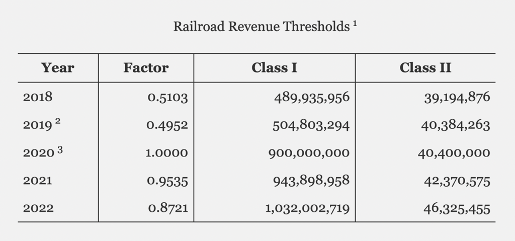 “The deflator factor is used by the railroads to adjust their gross annual operating revenues for classification purposes,” according to the STB. “This indexing methodology ensures that railroads are classified based on real business expansion and not on the effects of inflation. Classification is important because it determines the extent to which individual railroads must comply with the Board’s reporting requirements.”