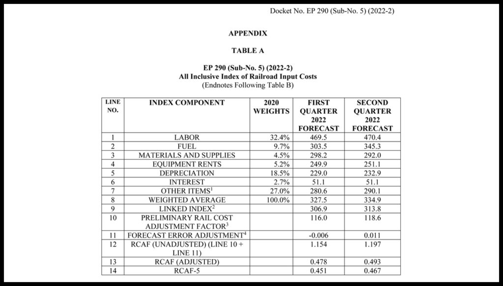 The STB on March 16 reported that it has reviewed AAR’s submission and adopted these figures for second-quarter 2022: unadjusted RCAF, 1.197 (up 3.7% from first-quarter 2022’s 1.154); adjusted RCAF, 0.493 (up 3.1% from first-quarter 2022’s 0.478); and RCAF-5, 0.467 (up 3.5% from first-quarter 2022’s 0.451).