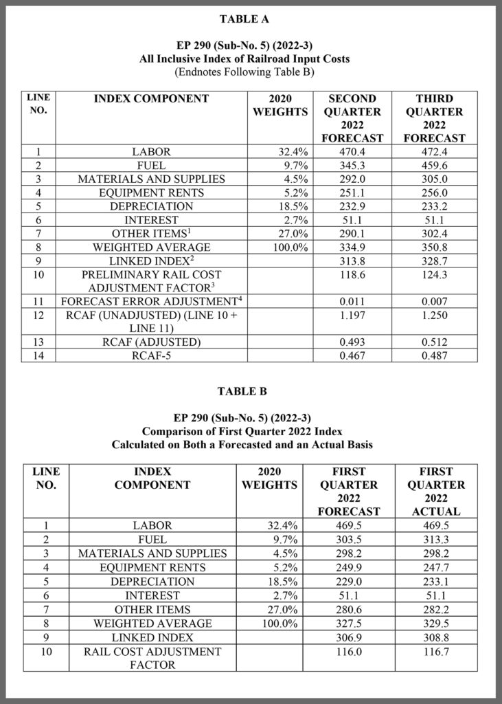 The Board, in Docket No. EP 290 (Sub-No. 5), downloadable below, “finds that the third quarter 2022 RCAF (Unadjusted) is 1.250, RCAF (Adjusted) is 0.512, and RCAF-5 is 0.487. The index of railroad input prices, RCAF (Unadjusted), RCAF (Adjusted), and RCAF-5 for the third quarter of 2022 are shown in Table A (below). Table B shows the first quarter 2022 index and the RCAF calculated on both an actual and a forecasted basis. The difference between the actual calculation and the forecasted calculation is “the forecast error adjustment.”