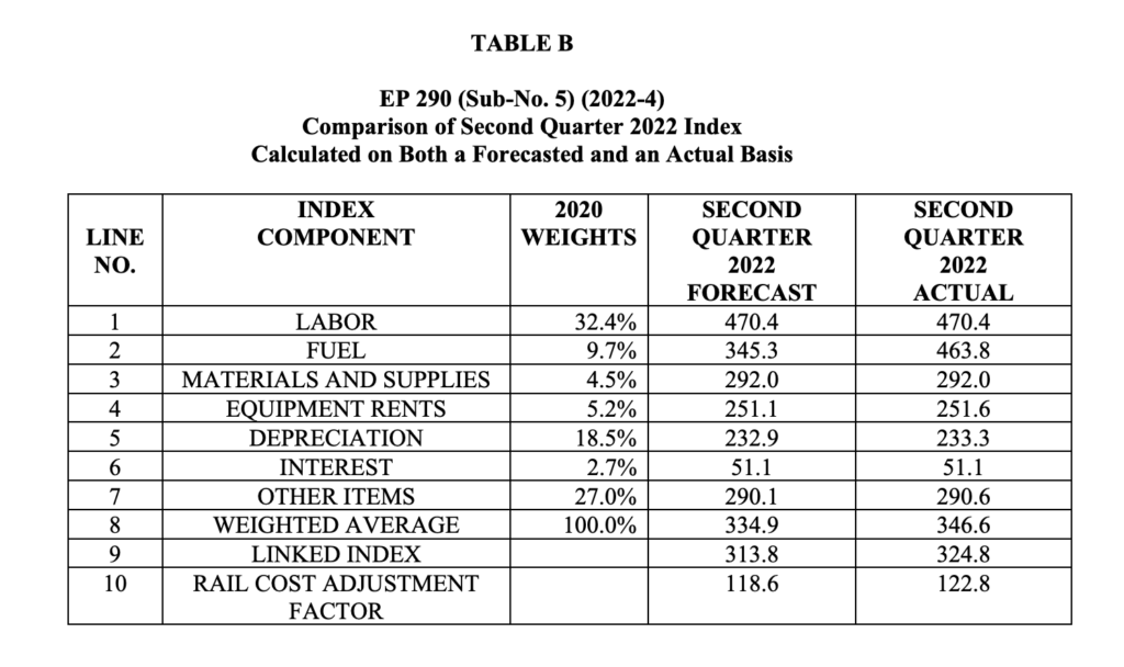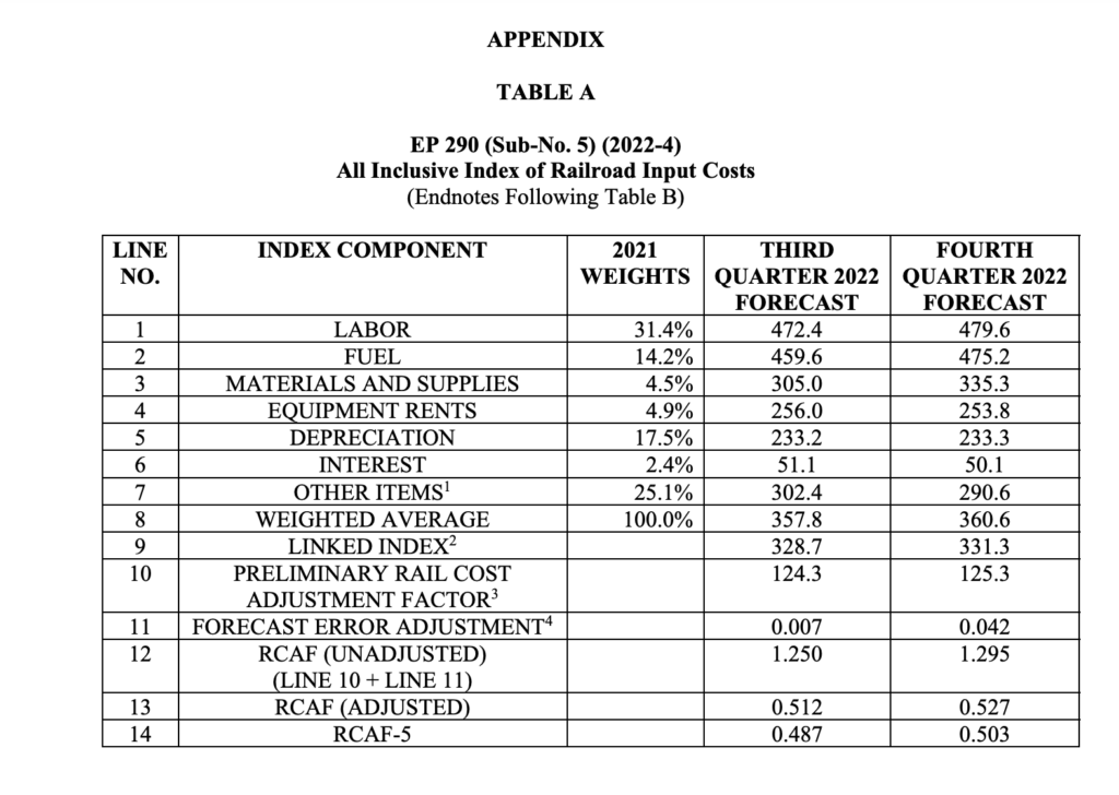 The STB on Sept. 20 reported that it has reviewed AAR’s submission and adopted these figures for fourth-quarter 2022: unadjusted RCAF, 1.295 (up 3.6% from third-quarter 2022’s 1.250); adjusted RCAF, 0.527 (up 2.9% from third-quarter 2022’s 0.512); and RCAF-5, 0.503 (up 3.3% from third-quarter 2022’s 0.487).